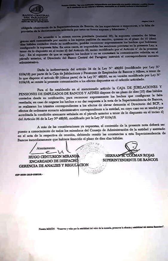 Ante una primera respuesta evasiva y posterior falta de retorno por parte de la Caja Bancaria, la que se califica como falta grave, según la Ley 489/95 en su Artículo 89, la Superintendencia de Bancos, comunica por Nota SB. SG. Nº 00740/2019 de fecha 18/julio/2019, que se le fija un plazo de 10 días desde su notificación para que el ente jubilatorio reconozca expresamente los hechos que configuran la falta grave, a efectos de ordenarse sumario administrativo a dicha entidad, sin tener acreditada la condición de atenuante.