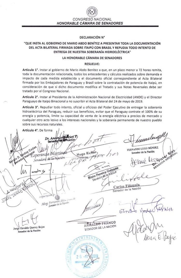 En la declaración aprobada por mayoría, en la tarde de este viernes, en el primer punto se pide toda la información referida al acuerdo entre los gobiernos de Paraguay y Brasil sobre la venta de energía de Itaipú.