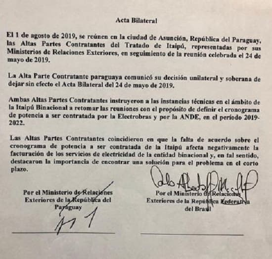 Debido a la firma del acuerdo del acta bilateral que se llevó a cabo el 24 de mayo, por los gobiernos de Paraguay y Brasil, se generó una crisis política que derivó incluso a plantear un juicio político al Presidente Mario Abdo y vicepresidente Hugo Velázquez.