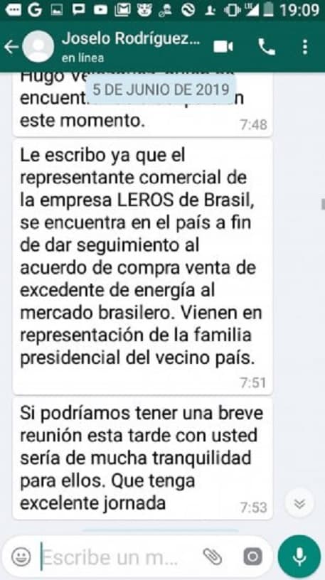 Según lo dado a conocer por Última Hora, en el chat del 9 de mayo, días antes de la firma del polémico acuerdo energético, el abogado en cuestión enviaba mensajes al por entonces titular de la Ande.