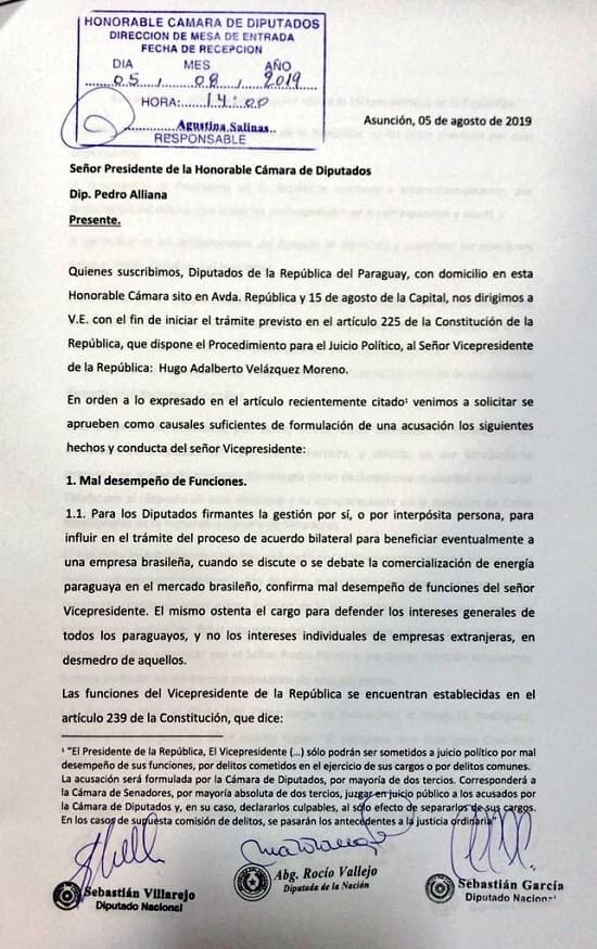 En relación al tema, los legisladores de Patria Querida presentaron una nota dirigida al titular de la Cámara de Diputados, Pedro Alliana, para dar inicio al trámite de juicio político a Velázquez, con base en lo que establece el artículo 225 de la Carta Magna.