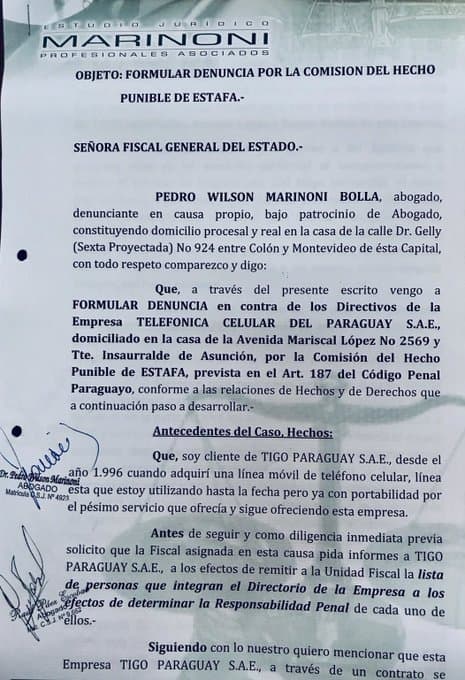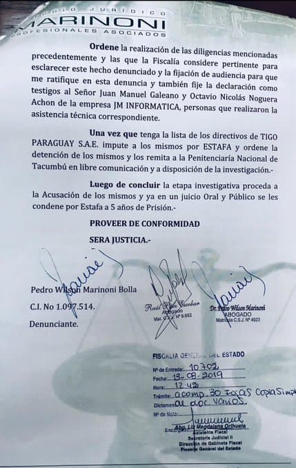 “Aquí está la denuncia presentada contra los Directivos de @TigoParaguay por ESTAFA. Consta abajo el cargo de presentación y espero que la Fiscalía por el bien de nuestros compatriotas haga un buen trabajo y castigue a estos ladrones que nos roban con un supuesto servicio”, tuiteó el hombre de leyes, adjuntando las imágenes de su escrito.