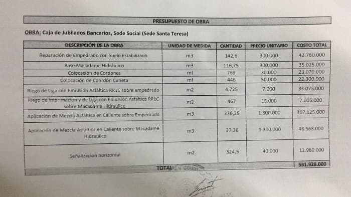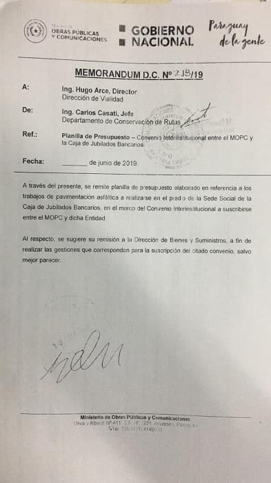 Por otra parte, Radio 1000 AM accedió a un memorándum, donde se manifiesta que a través de un convenio firmado entre la estatal y la Caja de Jubilados Bancarios, el MOPC debía realizar obras de pavimentación en el predio de la sede social por un valor superior a los G. 500 millones.