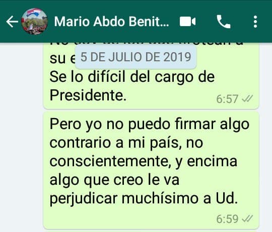 Además publicó de nuevo una captura de la conversación con el mandatario, Mario Abdo Benítez, “para que sirva de ejemplo, inspiración o advertencia”.