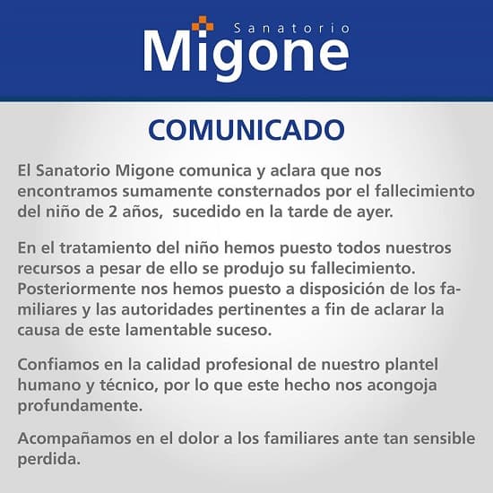Desde el centro asistencial emitieron una nota en la que se lamenta la muerte del pequeño.