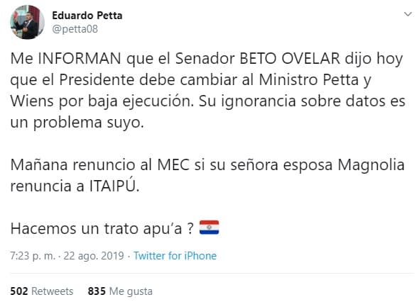 En comunicación con Radio 1000 AM, Orrego criticó además al ministro de Educación, Eduardo Petta, por el polémico tuit que lanzó contra el senador Silvio “Beto” Ovelar.