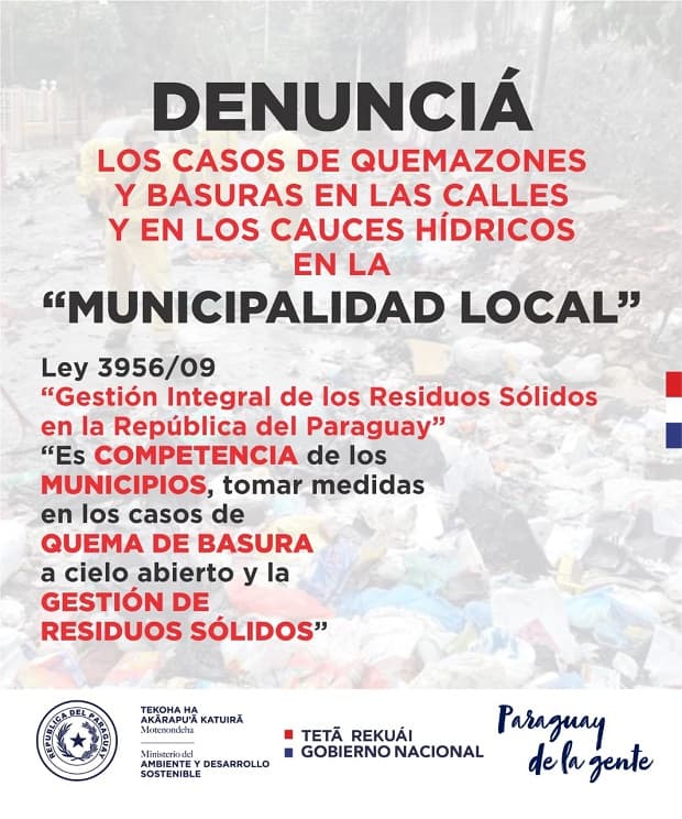 El Mades advirtió, mediante un comunicado, que es competencia de los municipios, tomar medidas en los casos de quema de basura como señala la ley que regula la “Gestión Integral de los Residuos Sólidos en la República del Paraguay”.