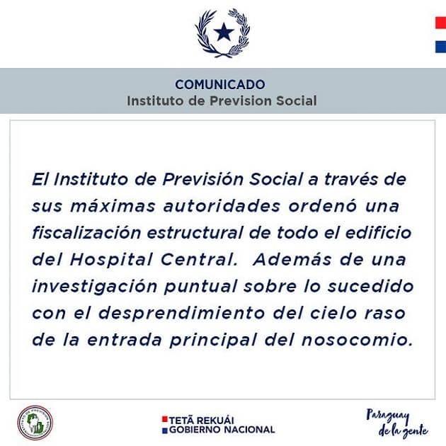 Desde el Instituto de Previsión Social (IPS) emitieron un comunicado para anunciar que se ordenó una fiscalización estructural de todo el edificio del Hospital Central. En el marco del derrumbe del cielorraso en la entrada del centro asistencial.
