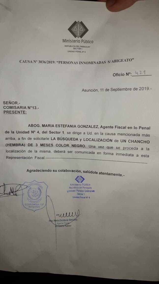 Aunque parezca inverosímil, la fiscala María Estefanía González pidió a los agentes de la Comisaría 13, de Itá Enramada, que se encarguen de la búsqueda y localización de un “chancho hembra de color negro”.