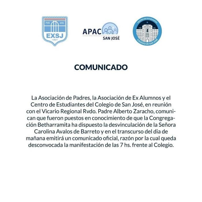 De acuerdo al comunicado emitido en la mañana de este jueves, por parte de la Asociación de Padres, la Asociación de Ex Alumnos y el Centro de Estudiantes, el vicario regional de la congregación Sagrado Corazón de Jesús de Bétharram, el sacerdote Alberto Zaracho, confirmó que la directora administrativa Carolina Ávalos fue destituida del cargo.