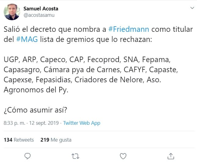 Los gremios que rechazan el nombramiento de Mario Abdo Benítez.