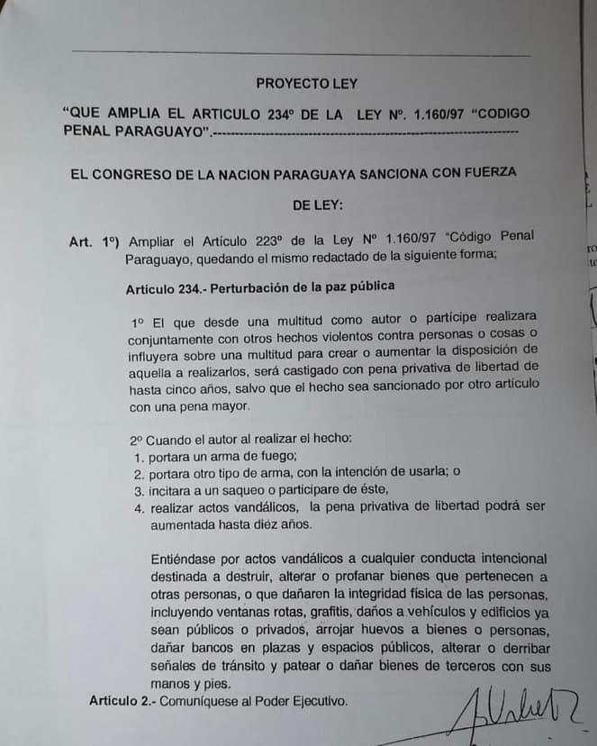 El proyecto de ley presentado por Urbieta señala que desea modificar el Artículo 234 del Código Penal, que hace referencia a la Perturbación de la Paz Pública.