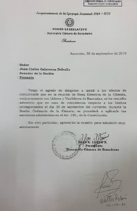 De acuerdo a lo remitido por el presidente del Senado, tanto líderes como vicelíderes de Bancada decidieron advertir al legislador colorado. En el mismo tenor fue notificado Paraguayo Cubas.