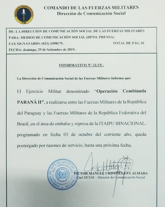 La tarea, en donde fuerzas militares de Paraguay y Brasil iban a simular una invasión a Itaipú, fue suspendida por motivos de “servicio”. La postergación del evento fue comunicado a través de una nota firmada por el coronel Víctor Urdapilleta.