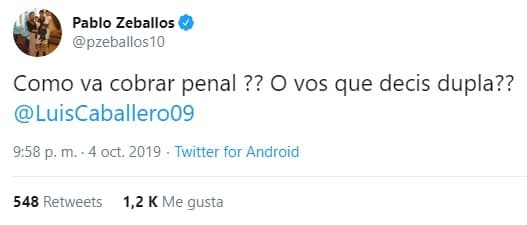 Ante toda esta situación, Zeballos soltó un picante tuit, mencionando a Caballero: “Como va cobrar penal ?? O vos que decis dupla?? (sic)”.