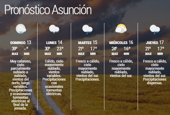 La Dirección de Meteorología anuncia para este domingo, un ambiente muy caluroso en todo el territorio nacional. Las temperaturas máximas que oscilarían entre los 37°C y 41 °C.