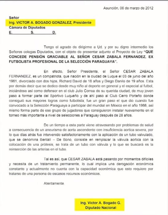 Una nota para solicitar una pensión graciable para un exfutbolista paraguayo fue presentada en el 2012 por el entonces presidente de la Cámara Baja, Víctor Bogado, para sí mismo.