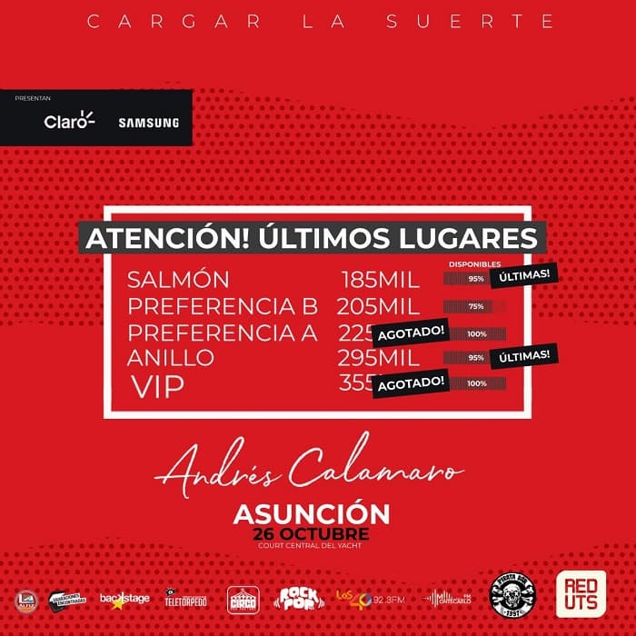 La cita es este sábado en Yacht y Golf Club Paraguayo. Las entradas que aún están disponibles son el Salmón de G. 185.000 y Anillo, de G. 295.000.