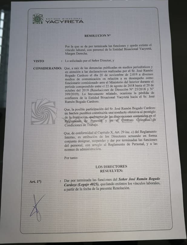 A raíz de las denuncias publicadas en medios periodísticos y en atención a las declaraciones realizadas en la fecha por el señor José Ramón Bogado Cardozo sobre su desempeño como funcionario comisionado ante el Ministerio del Interior, el director de la Entidad Binacional Yacyretá (EBY), Nicanor Duarte Frutos, decidió dar por terminadas las funciones del mismo, quedando extinto su vínculo laboral con la institución.