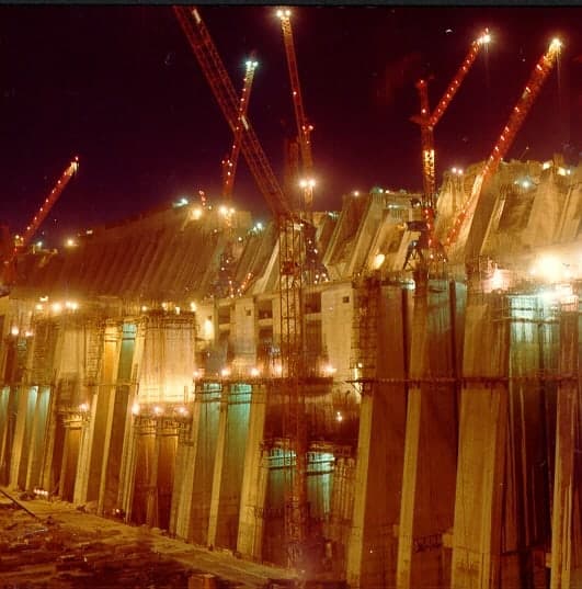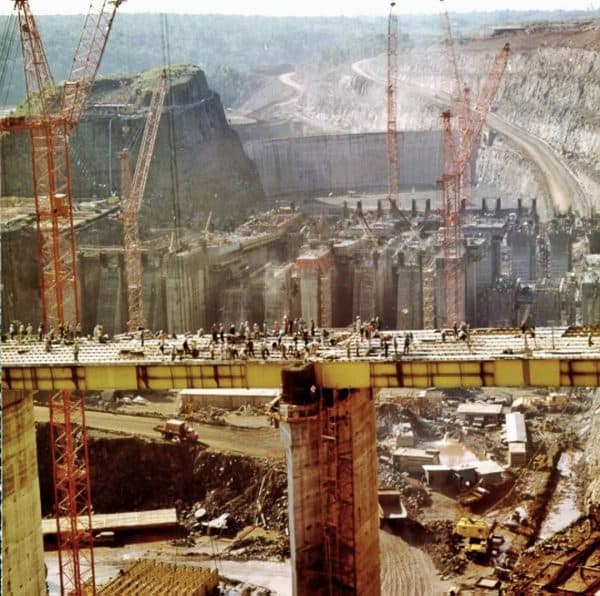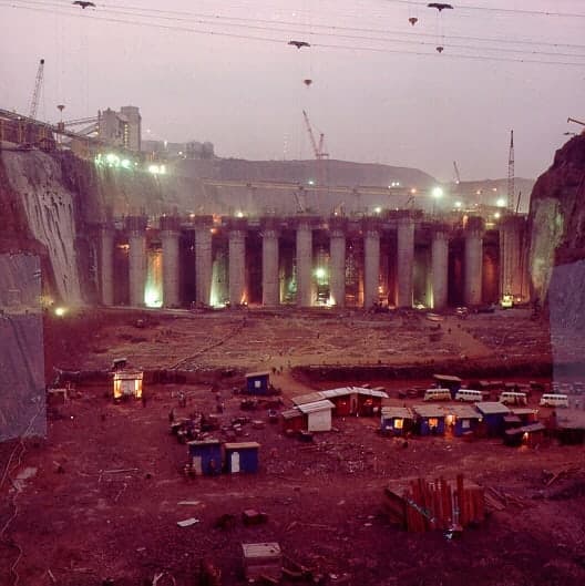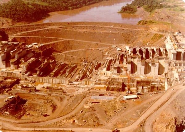 Esta fotografía fue tomada en 1979. En ella se puede observar la construcción de la Casa de Máquinas, la presa principal y la presa lateral derecha.
