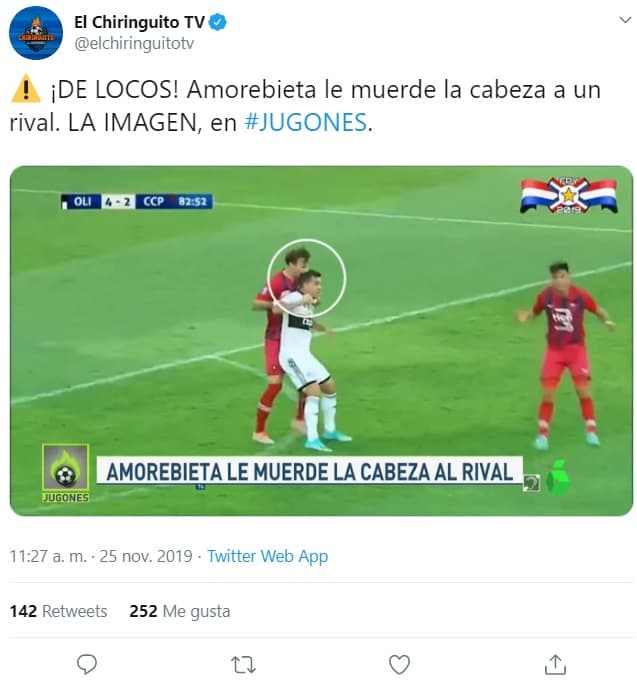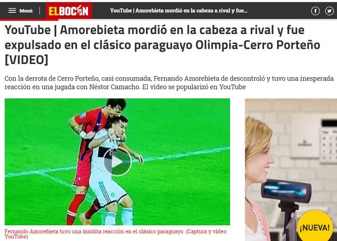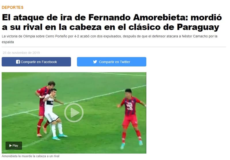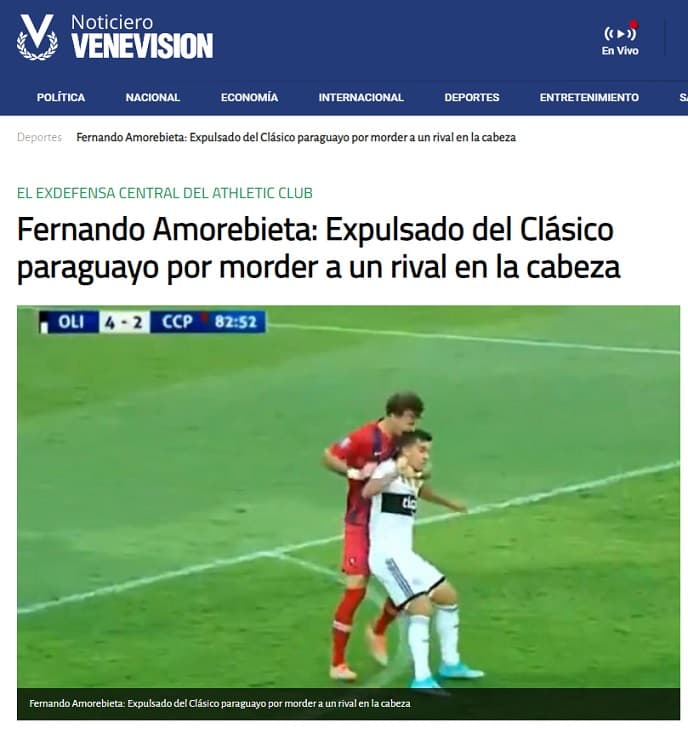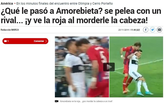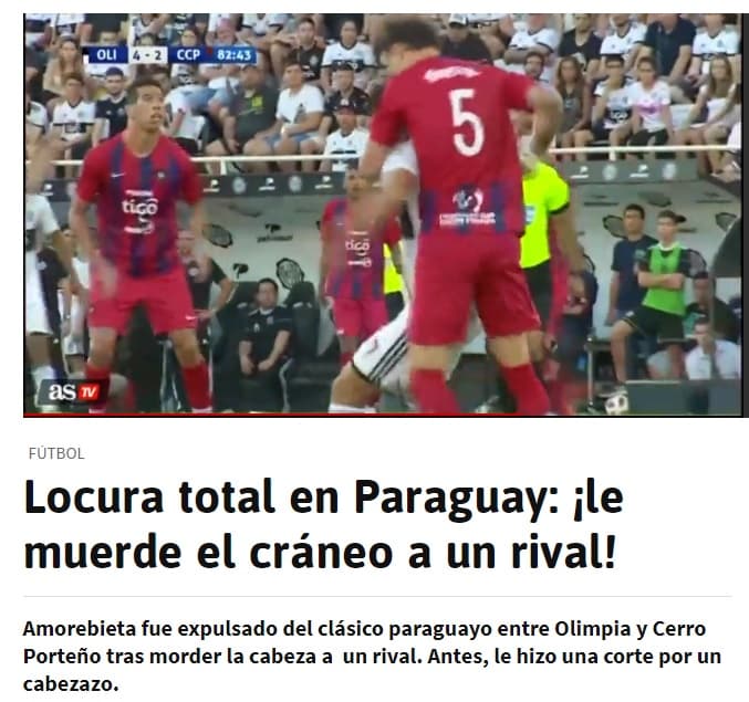 Cerca del final del partido entre Olimpia y Cerro Porteño, ocurrió algo inédito en el fútbol local, Amorebieta mordió en la cabeza a Camacho.