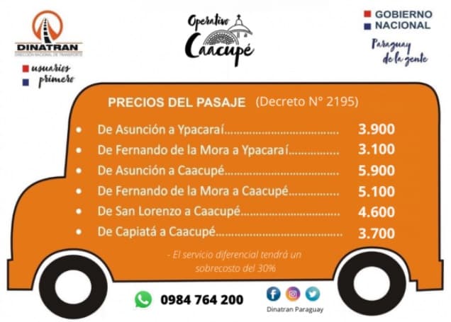 El director de la Dinatran, Juan José Vidal detalló que los precios vigentes son; desde Asunción a Ypacarai G. 3.900, de Fernando de la Mora Ypacaraí G. 3.100, de Asunción a Caacupé G. 5.900, de Fernando de la Mora a Caacupé G. 5.100 de San Lorenzo a Caacupé G. 4.600 y de Capiatá a Caacupé G. 3.700.