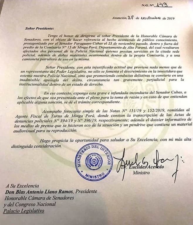 El documento fue enviado durante la jornada de este miércoles y en su parte más sustanciosa manifiesta: “…expongo esta grave e infundada inconducta del Senador Cubas, a los efectos de que sea presentada ante el pleno para la toma de razón y en caso de que se entiendan aplicable alguna sanción, se dé el trámite correspondiente”.
