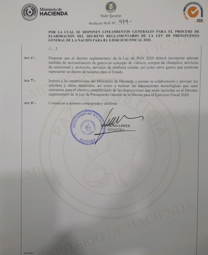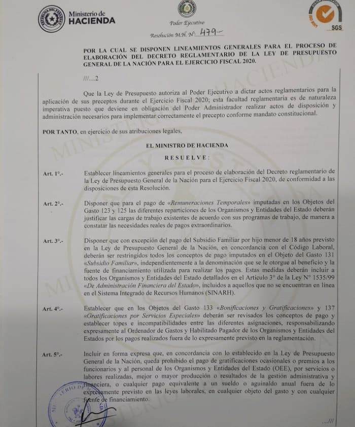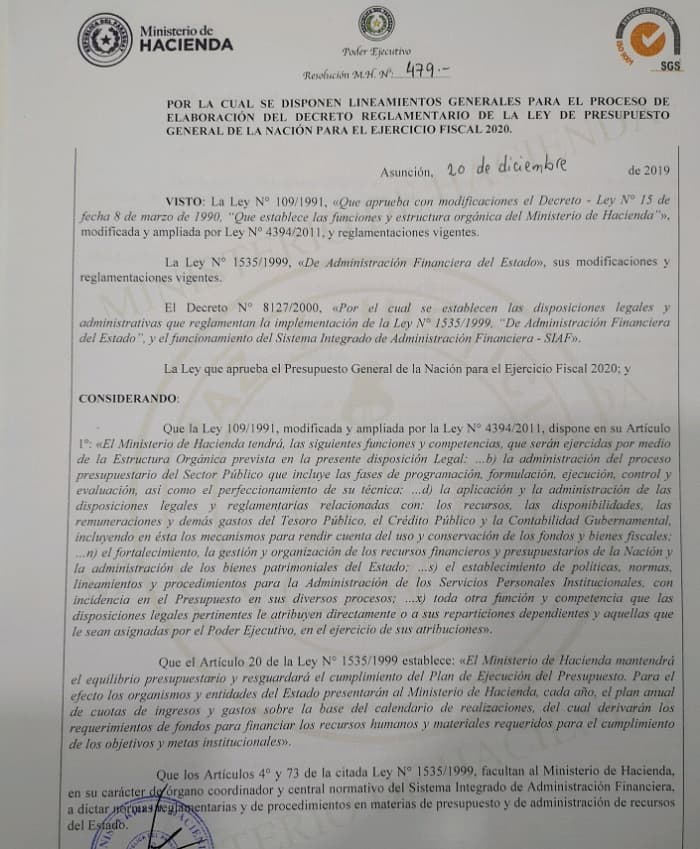 El Ministerio de Hacienda emitió este viernes la resolución MH N° 479 con la cual se establecen los lineamientos generales para el proceso de elaboración del Decreto Reglamentario de la Ley de Presupuesto General de la Nación (PGN) para el ejercicio fiscal 2020.