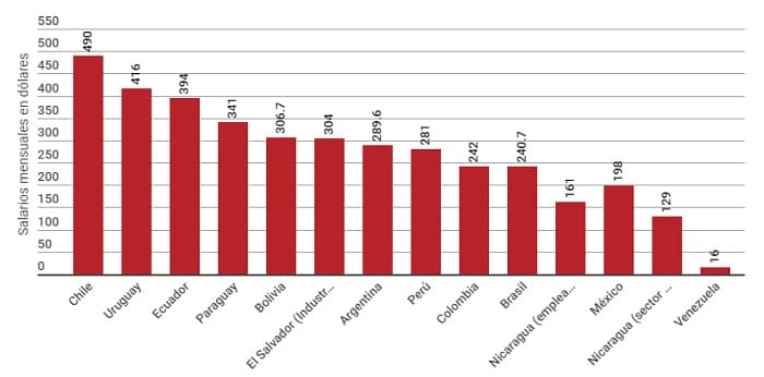 Ya entre los países con sueldos más inferiores se hallan El Salvador, Argentina, Perú, Colombia, Brasil, Nicaragua, México y por último Venezuela con tan solo USD 16.
