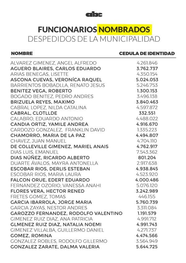 La Municipalidad se negó a proporcionar los datos de las listas hasta ahora. En la conferencia realizada la semana pasada, el intendente Óscar Rodríguez (ANR) había anunciado que entre los desvinculados había 60 funcionarios nombrados, 42 jornaleros, 123 contratados, 80 personas que cobraban honorarios a la Comuna y otros 80 con comisiones de otras instituciones.