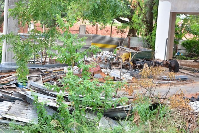 Una estación de servicio a medio construir está totalmente abandonada. En el lugar, no solo se acarrean cosas en desuso, sino que también basuras y malezas, por lo que es un potencial criadero del mosquito Aedes Aegypti.