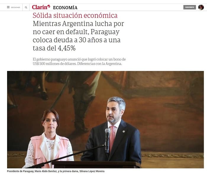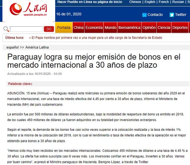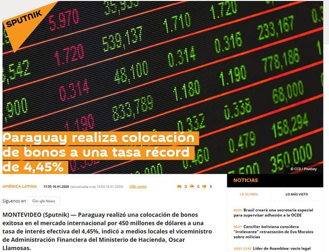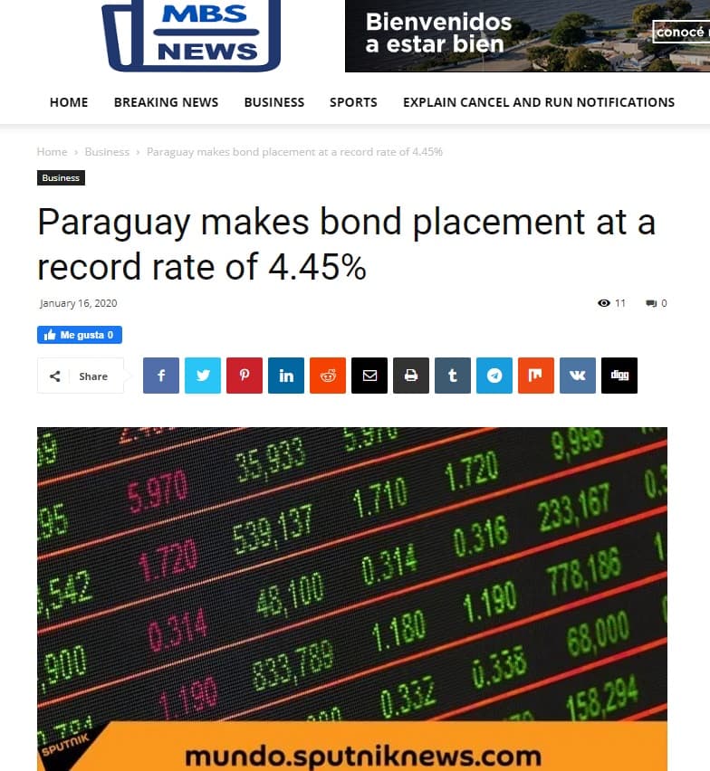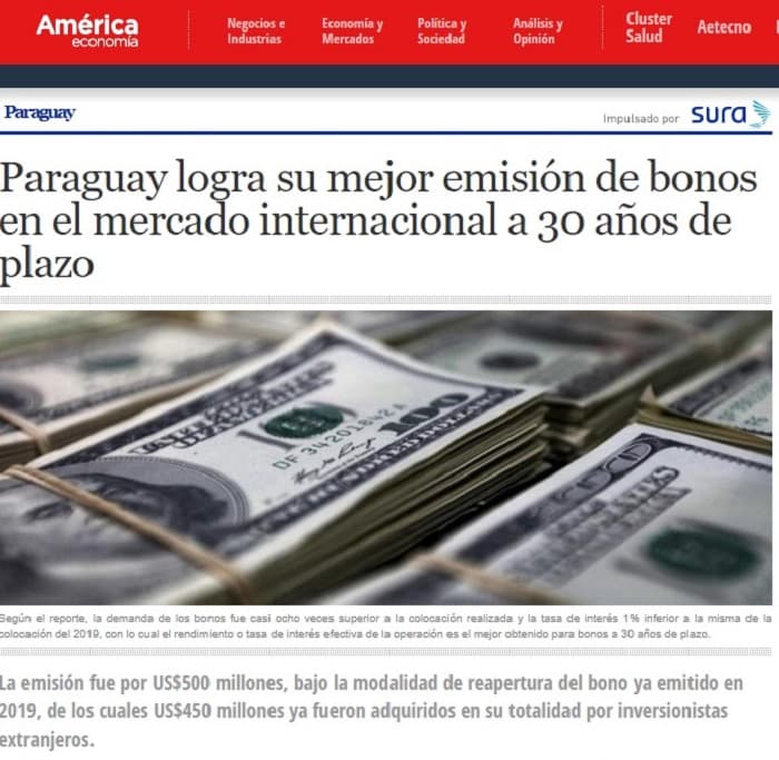 Portales internacionales de noticias publicaron en sus espacios informativos el logro de Paraguay referente a la colocación de los bonos por parte de Paraguay en el mercado extranjero.