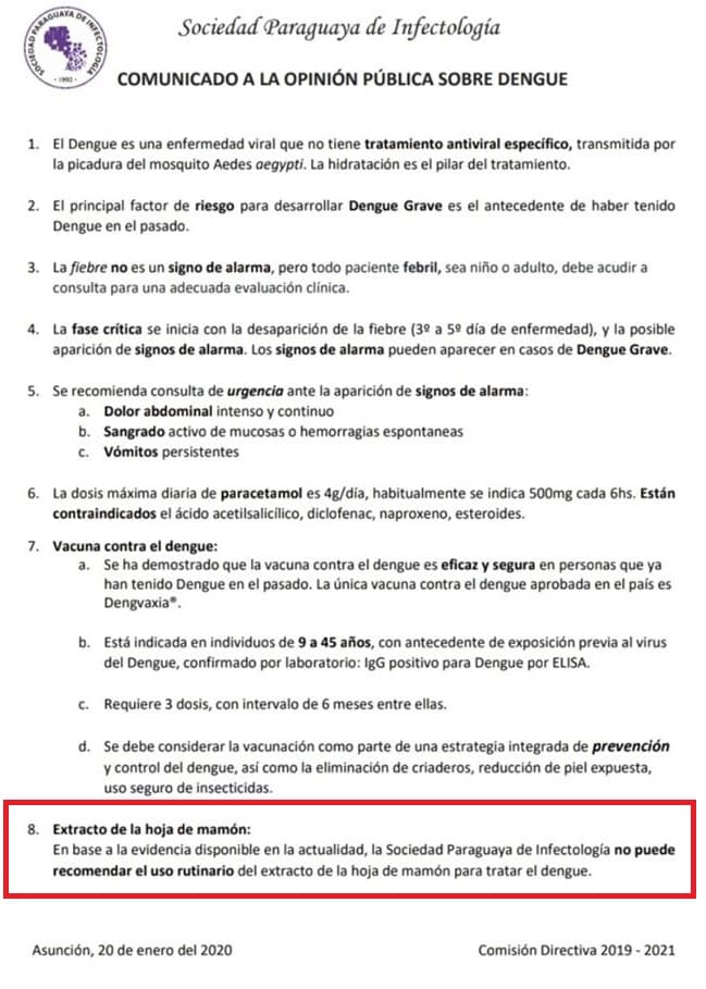 Tras las últimas versiones de que la hoja de mamón ayudaba en el tratamiento del dengue, la Sociedad Paraguaya de Infectología se expidió al respecto.