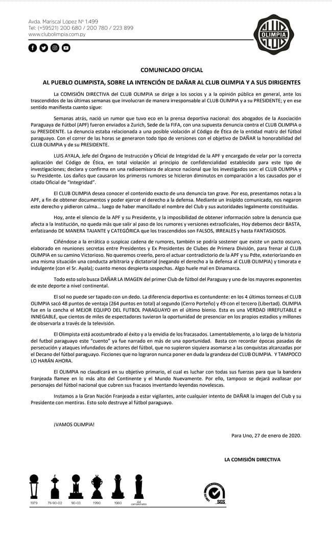 El Club Olimpia emitió un comunicado dirigiéndose a sus aficionados y a la opinión pública, con el fin de dar a conocer los hechos que tuvieron por objetivo: Manchar la imagen de la institución deportiva.