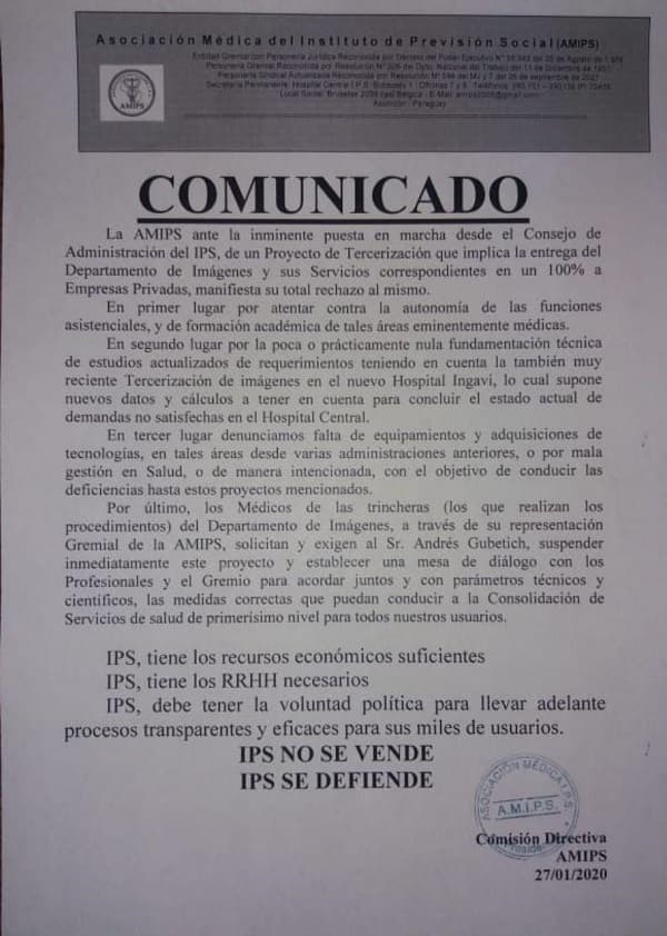 Desde la AMIPS emitieron un comunicado y en el mismo expresan su repudio ante la puesta en marcha del Consejo de Administración de IPS en la tercerización del departamento de imágenes de la mano de empresas privadas.