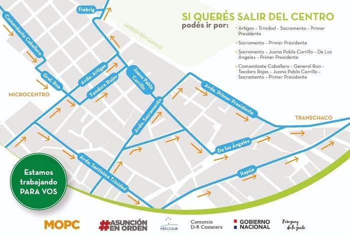 Para salir de la ciudad, los automovilistas que salen por Artigas, al llegar a la calle Juana Pabla Carrillo (una cuadra antes de Primer Presidente) tendrán la opción de girar a la derecha para avanzar tres cuadras, después hacer otro giro a la izquierda en Sacramento para tomar Primer Presidente nuevamente y dirigirse hacia la Transchaco.