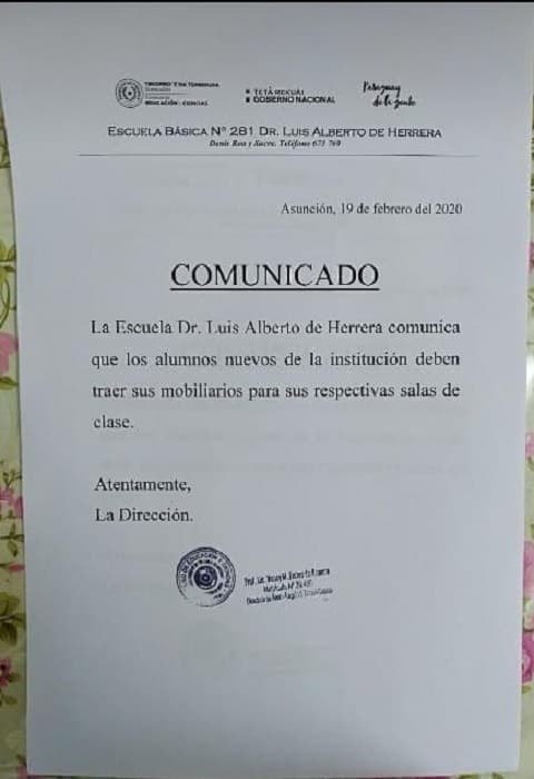 Un supuesto comunicado de la Escuela Dr. Luis Alberto de Herrera circuló entre los miembros de la institución, en donde las autoridades solicitaban que los propios alumnos debían ir con sus mobiliarios al primer día de clases. Esta misiva fue desmentida por la directora.