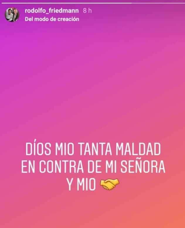 Friedmann Cresta publicó en su cuenta en Instagram un mensaje en el cual afirma: “Dios mio tanta maldad en contra de mi señora y mio (sic)”.