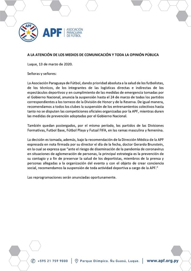 La Asociación Paraguaya de Fútbol (APF) decidió suspender el campeonato local de fútbol, en todas sus categorías, además el ente rector pide cesar los entrenamientos.