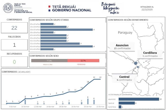 Este lunes, el Ministerio de Salud brindó un informe detallado del avance del Covid-19 en nuestro país. Hasta el momento son 22 los casos confirmados, de los cuales la mayor parte se concentra en Asunción y el departamento Central.