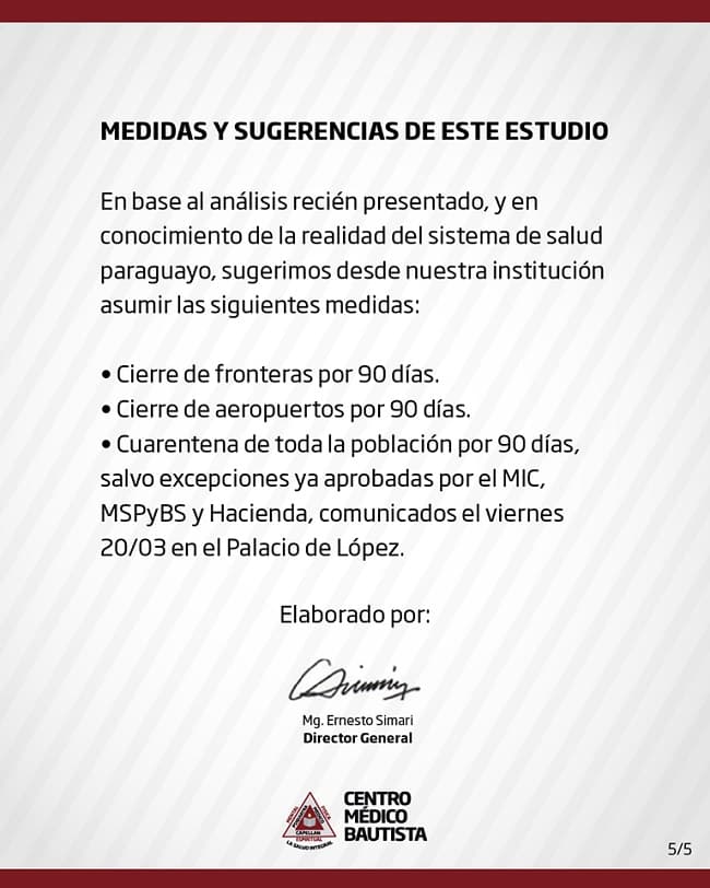 El director general del Centro Médico Bautista, Ernesto Simari, realizó un estudio en base a la propagación del Covid-19 en nuestro país y recomendó la extensión de la cuarentena a 90 días.