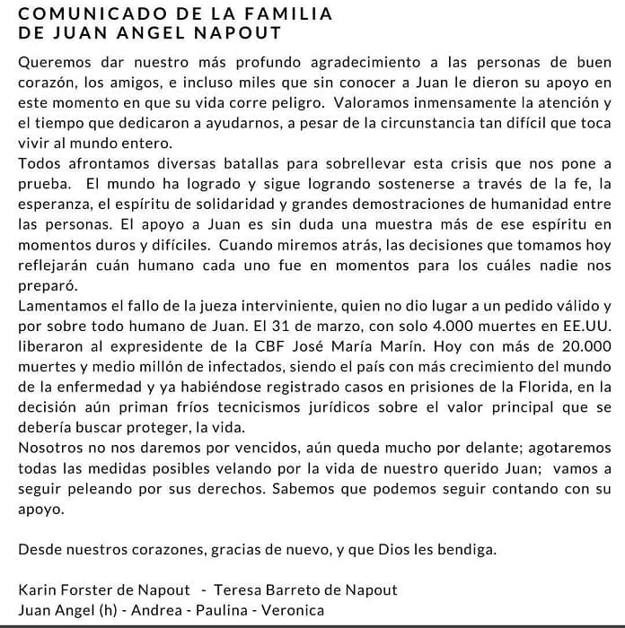 “Lamentamos el fallo de la jueza interviniente, quien no dio lugar a un pedido válido y por sobre todo humano de Juan”, expresa el comunicado que fue firmado por la esposa del ex dirigente, Karin Forster de Napout, y sus hijos, Juan Ángel, Andrea, Paulina y Verónica.