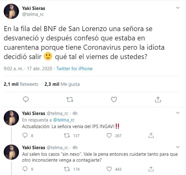 Inicialmente había corrido en redes sociales la versión de que una paciente de coronavirus se desvaneció en un cajero del Banco Nacional de Fomento (BNF) en San Lorenzo. Más tarde el fiscal Cristian Roig confirmó tal cuestión, pero que ocurrió en el interior de un local de la entidad, en el kilómetro 14,5 de la ruta PY 02.