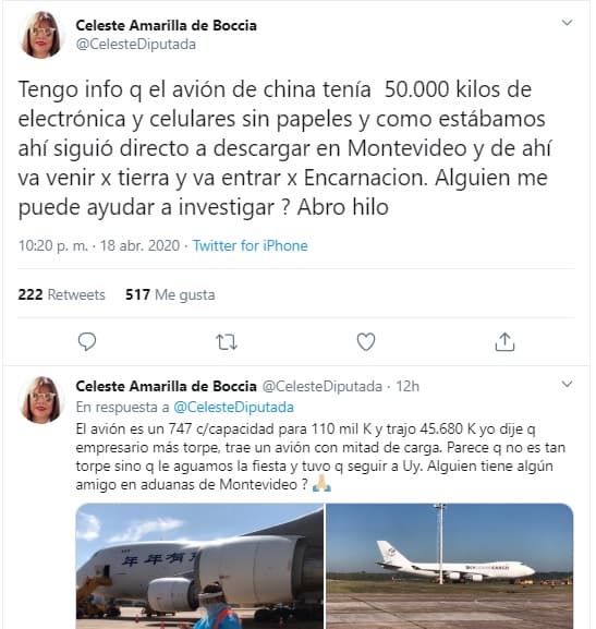 La diputada liberal Celeste Amarilla denunció en redes sociales que el avión carguero que llegó el sábado en horas de la mañana tenía decenas de toneladas de electrónicos “sin papeles”.