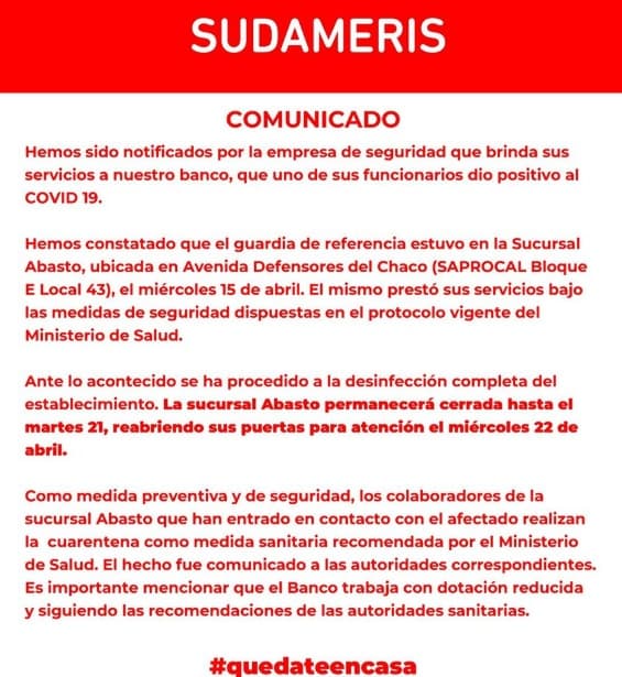 “Hemos constatado que el guardia de referencia estuvo en la Sucursal Abasto, ubicada en Avenida Defensores del Chaco (SAPROCAL Bloque E Local 43), en miércoles 15 de abril. El mismo prestó sus servicios bajo las medidas de seguridad dispuestas en el protocolo vigente del Ministerio de Salud”, señala el escrito.