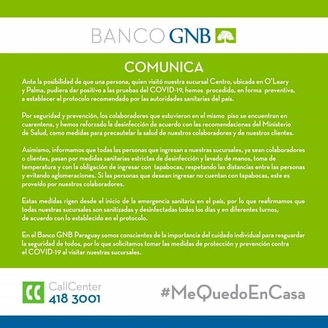 La otra entidad fue el Banco GNB que expresó también a través de un escrito, que existe la posibilidad de que una persona que estuvo en la sucursal ubicada sobre O’Leary y Palma, esté con un cuadro de coronavirus.