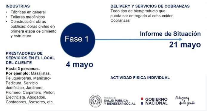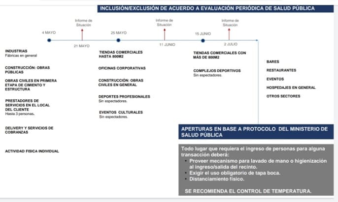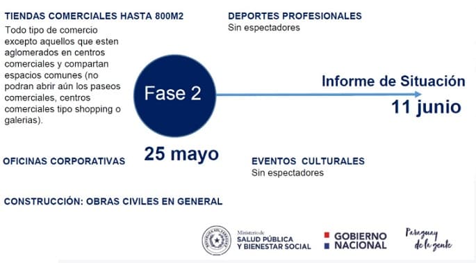 En cuanto a la fase 2, iniciará el 25 de mayo y las actividades se retomarán en las tiendas comerciales de hasta 800 metros cuadrados, oficinas corporativas, las obras civiles en general y los deportes profesionales (sin espectadores).