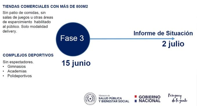 La fase 3 inicia el 15 de junio y abarca las tiendas comerciales con más de 800 metros cuadrados, sin patio de comidas, sin salas de juegos u otras áreas de esparcimiento, habilitado al público. Solo modalidad delivery. También se incluyen complejos deportes, los cuales abarcan los gimnasios, academias, polideportivos.