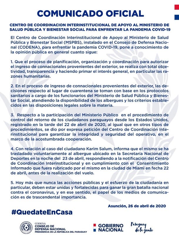 Indican, además, que en relación con el caso del ciudadano Karim Salum, este se trasladó voluntariamente del albergue dispuesto en la Secretaría Nacional de Deportes en la noche del 23 de abril pasado.