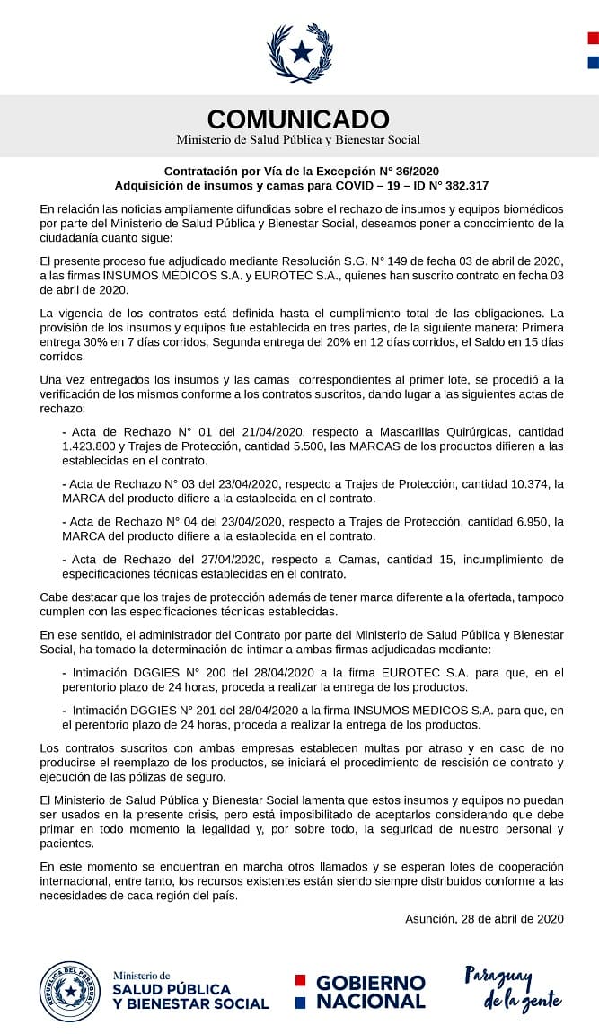 “Los contratos suscritos con ambas empresas establecen multas por atraso y en caso de no producirse el reemplazo de los productos, se iniciará el procedimiento de rescisión de contrato y ejecución de las pólizas de seguro”, indica el escrito.